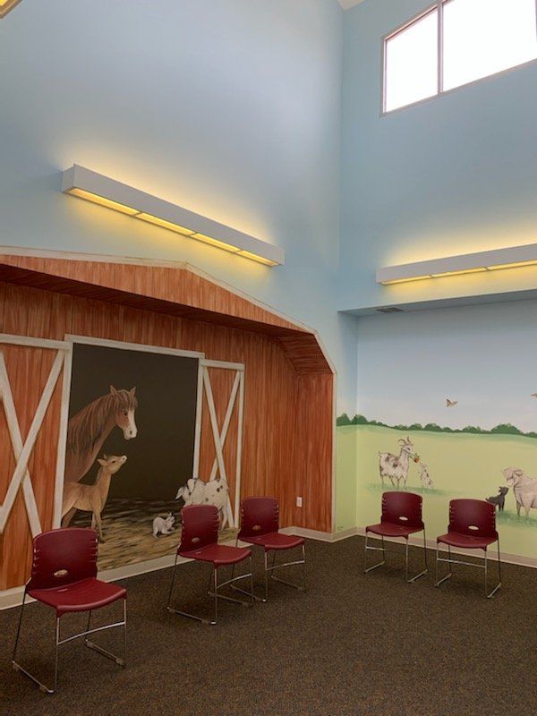Even before you meet the Doctor, you will see that our office is designed especially for your children. A custom painted waiting room entertains young minds while waiting to see the doctor. All three walls are beautifully finished in a full farm mural with barn, pasture, pond scenes, and plenty of farm friends. We also have a flat screen TV playing their favorite children's movies.
